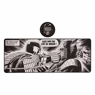 Dredd is a Judge - and Judges are not ordinary men! Never a truer word said, as Dredd punched Judge Fear so powerfully his fist broke through the back of Fear's helmet! This panel, taken from 2000 AD Prog 227 published in 1981, is one of the most iconic images in comics history, part of the influential Dark Judges storyline.Topped with micro-textured fabric with reinforced edges and non-slip rubber base, this Judge Dredd desk pad measures 800x300x3mm and the non-slip coaster (which is made of the same material and depicts Judge Death) measures 100mm in diameter.- Officially licensed- Reinforced edges- Non-slip base- Desk pad - 800x300x3mm- Coaster - 100mm diameter