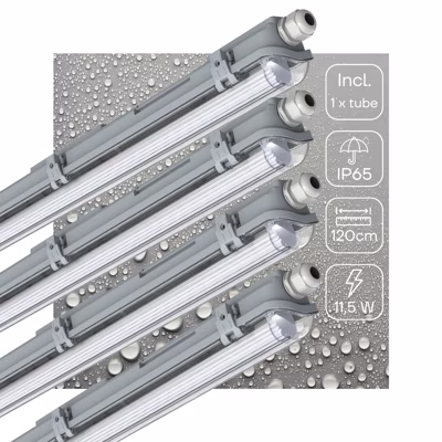 Het armatuur is stofdicht en beschermd tegen waterstralen (IP65). Dit maakt het ideaal voor gebruik in omgevingen waar vocht en stof aanwezig zijn, zoals garages en schuren.