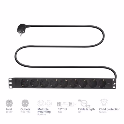 De PD3002 19” stekkerdoos PDU voegt negen geaarde type F stopcontacten toe aan een power managementsysteem. De stekkerdoos past in een 19” rack met 1HE. De PDU heeft een H05VV-F 3G1.5 kabel van 3 meter lang met een CEE7/7 connector. De montagebeugels kunnen in diverse posities worden geplaatst. Al het benodigde montagemateriaal wordt meegeleverd: kooimoeren, bouten en plastic ringen.