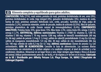 Advance Cat Adult Chicken / Rice 15 kgAdvance Cat Adult Chicken / Rice is volledig voer voor katten vanaf 1 jaar oud, op basis van kip en rijst, voor een ideale urine-PH. Dit voer van Advance ondersteunt jouw kat tijdens de langste periode van zijn leven, vanaf 1 jaar oud. Het voer ondersteunt het immuumsysteem van de kat en zorgt voor een goede darmwerking, door de makkelijk verteerbare kip en rijst. Omega 3 en 6 zorgen voor een gezonde huid en vacht en speciale mineralen helpen tandplak te voorkomen. Zeer effectief zijn ook de mineralen en ingrediënten die zorgen voor een optimale PH van de urine, wat blaasproblemen kan voorkomen. - Compleet voer voor katten vanaf 1 jaar - Zorgt voor een gezonde huid en vacht- Versterkt de weerstand- Met makkelijk verteerbare kip en rijst- Zorgt voor een goede PH van de urineSamenstelling: Kip (21%), maïs, gedehydrateerde pluimvee-eiwitten, maïs eiwit, rijst (8%), dierlijk vet, gestabiliseerd met gemengde tocoferolen van natuurlijke oorsprong, gedehydrateerde varkenseiwitten, gehydrolyseerde dierlijke eiwitten, visolie, kaliumcitraat, plasma-eiwitten, natuurlijke bron van immunoglobulinen (0,5%), kaliumchloride, zout, natuurlijke polyfenolen.Analytische bestanddelen: Ruw eiwit 36,0%, Ruw vet 15,8%, Ruwe celstof 1,5%, Ruwe as 6,9%.Nutritionele toevoegingsmiddelen (/kg): Vitamine A 27000 IE, Vitamine D3 1800 IE, Vitamine E 500 mg, Vitamine C 70 mg, Taurine 1200 mg, IJzersulfaatmonohydraat 260 mg (Fe: 86 mg), IJzerfumaraat 150 mg (Fe: 45 mg), Kaliumjodide 1,9 mg (I: 1,4 mg), Kopersulfaatpentahydraat 33 mg (Cu: 8,8 mg), Mangaansulfaat-monohydraat 123 mg (Mn: 40 mg), Zinksulfaat-monohydraat 407 mg (Zn: 148 mg), Natriumseleniet 0,2 mg (Se: 0,1 mg).Zoötechnische toevoegingsmiddelen (/kg): Ammoniumchloride 4g.Met natuurlijke antioxidanten.Inhoud: 15 kg