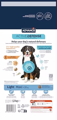 Advance Maxi Light 12 kg Advance Maxi Light 12 kg is een smakelijk hondenvoer speciaal gemaakt voor honden van grote rassen (vanaf 30 kg) met (het risico op) overgewicht. Dit smakelijke voer van Advance is gemaakt op basis van kip en rijst en speciaal samengesteld voor honden met overgewicht op het risico daarop. Het voer heeft een formule met weinig vet en veel eiwit; zo help je het gewicht van jouw hond te controleren zonder dat er spiermassa verloren gaat. Door het hoge vezelgehalte voelt jouw hond zich verzadigd en de samenstelling met kip en rijst zorgt voor een goede spijsvertering. Gemaakt zonder kunstmatige conserveringsmiddelen of kleurstoffen! De brokjes zijn speciaal aangepast aan het formaat van de hond en helpen een gezond gebit te ondersteunen.- Hondenvoer speciaal voor honden met overgewicht of het risico op overgewicht- Laag in vet- Rijk aan vezels, zorgt voor een verzadigd gevoel- Met veel eiwit, om te voorkomen dat de spiermassa verloren gaatVolledige diervoeding voor de hond.Inhoud: 12 kgSamenstelling: Kip (15%), volkoren tarwe (14%0, gedehydreerde eiwitten van pluimvee, erwtenvezel, rijst (10%0, volkoren maïs, maïseiwit, gedehydreerde eiwitten van varken, gehydrolyseerde dierlijke eiwitten (gevogelte, varken, vis), bietenpulp (1,7%), maïsmeel, pluimveevet, tarwevoerbloem, maïszemelgrint, mineralen, visolie, chicorei-inuline (0,4%), plasma-eiwitten van varken (natuurlijke bron van immunoglobulines) (0,4%), glucosamine (400 mg/kg), chondroïtinesulfaat (340 mg/kg)Analytische bestanddelen: Ruw eiwit 26,5%, ruw vet 9,5%, ruwe celstof 8,2%, ruwe as 7%Nutritionele toevoegingsmiddelen (per kg): Vitamine A 27000 IU, Vitamine D3 1200 IU, Vitamine E 500 mg, Vitamine C 70 mg, Taurine 1200 mg, L-Carnitine 250 mg, IJzer(II)sulfaat-monohydraat 260 mg (Fe: 86 mg), Kaliumjodide 1,9 mg (I: 1,4 mg), Koper(II)sulfaat-pentahydraat 33 mg (Cu: 8,8 mg), Mangaan(II)sulfaat-monohydraat 123 mg (Mn: 40 mg), Zinksulfaat-monohydraat 406 mg (Zn: 148 mg), Natriumseleniet 0,2 mg (Se: 0,1 mg), darmflorastabilisatoren: bacillus velezensis DSM 15544 1X10^9cfu, met natuurlijke antioxidanten