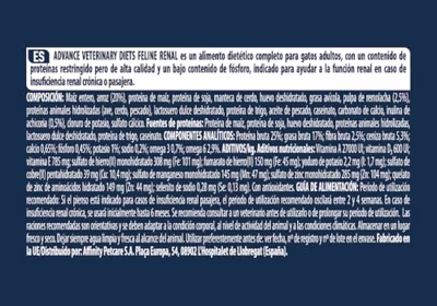 Advanced Kat VeterinaryTe gebruiken bij;nierfalencalciumoxalaat urolithiasisHet begin van congestief hartfalenHypertensieLeverziekte geassocieerd met encefalopathieEigenschappen;ph neutraallaag Fosfor gehalteVolledige diervoeding voor katten.Samenstelling;Maïs, rijst, maïsglutenmeel, dierlijk vet, gedehydrateerde varkenseiwitten, gedroogde eieren, sojameel, bietenpulp, gehydrolyseerde dierlijke eiwitten, droge zoete wei, gedroogde vis eiwitten, visolie, calciumcarbonaat, natrium-caseïnaat, kaliumchloride, inuline.Eiwitbronnen: maïsglutenmeel, sojameel, eieren, gedroogde dierlijke eiwitten, caseïnaat, wei.Analytische bestanddelen:Eiwit 25%; Vetgehalte 15,5%; Ruwe vezels 2,5%; Anorganische stof 5,3%; Calcium 0,8%; Fosfor 0,4%; Kalium 1,0%; Natrium 0,2%; Vocht 8,0%.Additieven / kg. nutritionele toevoegingsmiddelen;Vitamine A 30.000 IE, vitamine D3 2000 IE; Vitamine E 785 mg; Ijzersulfaat monohydraat 291 mg (IJzer: 96 mg); Ferro-fumaraat 150 mg (IJzer: 49 mg); kaliumjodide 2,1 mg (Jodium: 1.6 mg); Copper sulfaat pentahydraat 37 mg (Koper: 10 mg); Mangaan sulfaat monohydraat 138 mg (Mangaan: 45 mg); Zinksulfaat monohydraat 442 mg (Zink 161: mg); Natriumseleniet 0,26 mg (Selenium: 0,12 mg).Met antioxidanten.Inhoud: 1,5 kg
