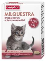 Dit product is uitsluitend bedoeld voor verkoop in Nederland.Milquestra Kleine Kat/Kitten 2 TablettenBreedspectrum ontwormingsmiddel voor kleine katten en kittens tot 2kg op basis van Milbemycine oxime en Praziquantel. Werkzaam tegen:- Lintwormen (Dipylidium caninum, Taenia spp. Echinococcus multilocularis)- Haakwormen (Ancylostoma tubaeforme)- Spoelwormen (Toxocara cati)- Hartwormziekte (Dirofilaria immitis), preventieve behandelingGeschikt voor katten vanaf 6 weken en 0.5kg lichaamsgewicht.Eenvoudig toe te dienen: meestal slechts 1 tablet per dierKleine tabletten met rundvleessmaakBreedst werkend ontwormingsmiddelBevat de nr. 1 gebruikte werkzame stoffen voor ontworming in Nederland Dosering:0.5 - 1kg: ½ tablet1 - 2 kg: 1 tablet2 - 3kg: 1½ tablet3 - 4 kg: 2 tablettenHoe vaak een wormkuur toegepast dient te worden hangt af van o.a. de leeftijd en de omgeving van het dier. Gemiddeld is dit 4x per jaar. Indien uw kat meegaat op vakantie, is het verstandig navraag te doen of voor het betreffende land een ander advies geldt.Lees voor gebruik de bijsluiter.EAN: 8711231139293