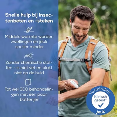 Beurer BR10 insectenbeethelerOf het nu gaat om reizen, wandelen, sporten of in het dagelijks leven - overal kunt u gestoken worden door vervelende muggen en andere insecten.Met de praktische karabijnhaak van de insectenbeetgenezer is eerste hulp tegen jeuk altijd bij de hand.Houd de insectenbeetgenezer eenvoudig 3 seconden op de beet en de jeuk zal worden verlicht.Extra klein model met karabijnhaakVoor het behandelen van insectenbeten en -stekenHelpt jeuk en zwelling te voorkomenWarmte versnelt de genezingSnel opwarmende keramische kookplaatProgramma van 3 seconden - ook voor de gevoelige huidMedisch apparaatIncl.2 x 1,5V AAA-batterijenKleur: wit
