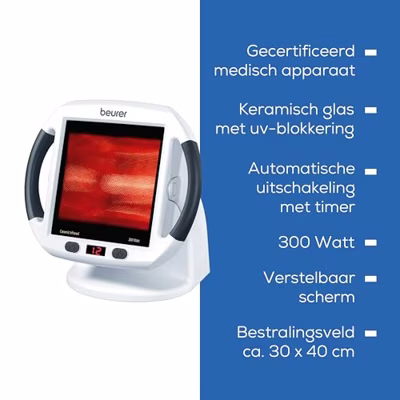 Netaansluiting: AC 220 V - 240 V / 50 - 60 HzStroomverbruik: 300 WTimer: Instelbaar van 1 - 15 minuten in stappen van 1 minuutAfmetingen: 27 x 27 x 19 cmBedrijfsomstandigheden: Temperaturen 10 º C tot 35 graden C / Relatieve Vochtigheid 50% - 90%Beschermingsklasse: 2Stralingsintensiteit: max. 200 W per vierkante meterIR-type: A + BUV-bescherming: 100% UV-beschermingWettelijke compliance: EN 60601-1-2Verwijdering: in overeenstemming met AEEA-richtlijnAutomatische uitschakeling: JaAan/Uit-schakelaar: Ja