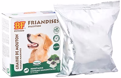 BF Petfood Schapenvet Bonbons Maxi Zeewier 40stDe BF Petfood Schapenvet Bonbons Maxi Zeewier 40st is een natuurlijk middel ter ondersteuning van afweer, huid, vacht, (spijs)vertering en weerstand. Zeewier bevat mineralen, sporenelementen, aminozuren en vitaminen. Het is tevens een uitzonderlijk gezonde en smaakvolle toevoeging op de dagelijkse voeding. Schapenvet bevat ongeveer 58% verzadigde vetzuren en ongeveer 32% enkelvoudig onverzadigde vetzuren. Vet is een smaakmaker en belangrijk bij de transport van vitamine A, D, E en K in het lichaam. Daarnaast gaat het vetmetabolisme van de hond zeer efficiënt om met vet en zet vet om in energie. Aanvullend voedingsmiddel voor alle hondenrassen en alle leeftijden.- Schapenvet met zeewier- Zeewier bevat mineralen, sporenelementen, aminozuren en vitaminen- Gezonde toevoeging op de dagelijkse voedingInhoud: 40 stuksSamenstelling: Schapenvet (93%), zeewier (7%)Analytische bestanddelen: Ruw vet 93%, Ruw eiwit 1%, Ruwe as 2,5%, Ruwe celstof 2%, Vocht 0,7%, Koolhydraten 0,8%Toevoegingen (per kg): Vitamine A I.E. 2000, Vitamine D3 I.E. EAN: 8714831000437