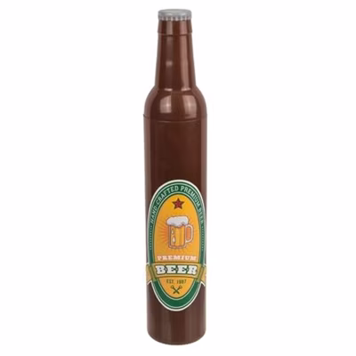 Bierfles paraplu van Out of the Blue. Paraplu die eruit ziet als een flesje bier. Compacte paraplu in een koker die eruit ziet als een langgerekte fles bier. Het handvat is de hals van de fles. De paraplu heeft een bruine kleur en is versierd met verschillende bierglazen. Diameter: 90 centimeter. Afmeting ingeklapt: 5 x 5 x 31 centimeter.