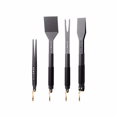 De Boretti BBQ gereedschapset bestaat uit: een tang, spatel, vork en pincet. Met deze set van Boretti heb je in één keer alle handige accessoires voor het barbecueën. De accessoires in de set hebben een prachtige antraciete kleur.Met de Boretti tang draai je de burgers eenvoudig om en verplaats je jouw gamba's eenvoudig. Met de spatel keer je makkelijk gerechten op de barbecue om op een veilige en snelle manier. De vork is ideaal voor het neerleggen van gerechten, zoals worstjes, op de barbecue en ook om ze er weer af te halen. De pincet van Boretti is perfect voor het omdraaien van dunne plakken groenten, vlees en vis op de barbecue.De accessoires zijn gemaakt van gepoedercoat duurzaam roestvrijstaal en hebben een gele lus voor het ophangen aan de barbecue.