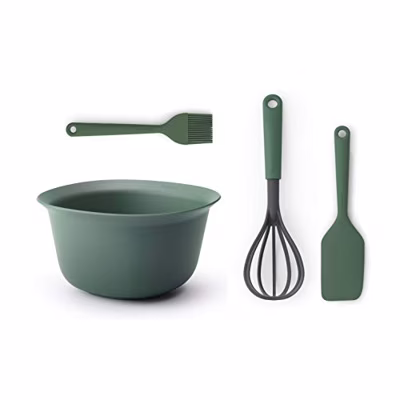 Brabantia tasty+ bakset 4 delig 123207Spullen klaar, bakken maar met de Brabantie tasty+ bakset: een handig kwartet voor bakken en mixen. Deze slimme set bestaat uit een mengkom van 3,2 liter, een garde plus schuimspaan, een spatel plus schraper en een bakborstel voor invetten. Zo is bakken een piece of cake!Voordelen & KenmerkenCompleet - set met mengkom, garde plus schuimspaan, spatel plus schraper en bakborstel.Handig - ergonomisch ontwerp.Zo schoon - vaatwasmachinebestendig.Ruim - mengkom maat L (3,2 liter).Glijdt niet - mengkom met antislip bodem.Goede grip, geen geknoei - ergonomische schenkrand op mengkom.Multi-talent - garde plus schuimspaan.Ruimtebesparend - open garde heeft minder opslagruimte nodig.Dubbel handig - spatel en schraper in één.Smeer 'm - bakkwast met lange haren.Krast niet - spatel plus schraper en bakborstel van siliconen.Veelzijdig - mengkom met hittebestendige coating (tot 100ºC/212ºF).Hittebestendig - max 220°C/448°F (garde/schuimspaan en