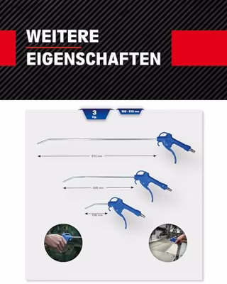 3-delige set elk een blaaspistool met buislengte 11 cm, 30 cm en 50 cm uitblaasbuis van metaal kunststof handgreep met ophangfunctie 1/4„PT Aansluitschroefdraad max. werkdruk 6,3 bar...