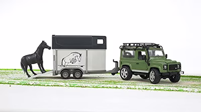 Bruder 02592 Landrover met paardentrailerVervoer je paarden met deze Landrover met paardentrailer. Geef je je paard een nieuwe stal, of ga je ermee naar een wedstrijd? Hetvervoer van je paard is nu geen probleem meer! Achter op de auto zit een reservewiel, dus als je met pech komt te staan kun je je band vervangen. En de achterbank is los te halen. Van de paardentrailer kunnen de deur en de klepgeopend worden ende stahoogte is aan te passen.LandroverPaardentrailerPaard