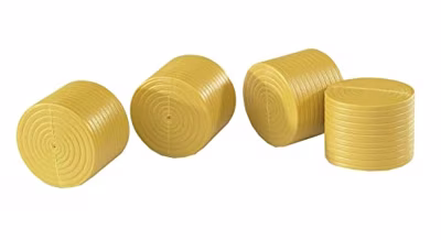 De vier ronde balen (oker-bruin), zonder wikkel, geschikt voor onder andere de Claas Rollant 250 rondebalenpers....