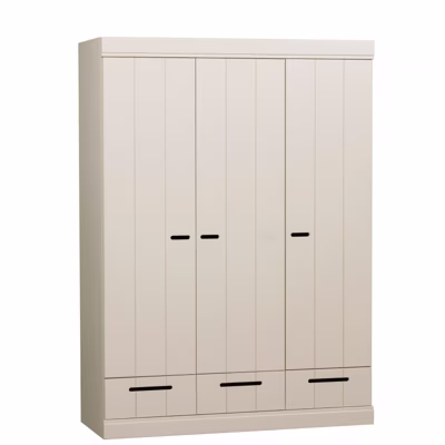 Kledingkast Connect van woonmerk WOOOD is een grenen kast met een moderne en robuuste uitstraling. Het grenenhout is afgewerkt in kleur Dust, een grijs/beige tint. De nerven en knoesten zijn nog steeds zichtbaar en deze natuurlijke kenmerken geven er karakter aan. De kledingkast heeft een verticale V-groef en sleuven in het hout als grepen. Dit maakt 'm ook nog eens heel kindvriendelijk! Deze Connect kledingkast is een robuuste en tijdloze opbergkast, die je overal in huis kunt gebruiken.Indeling:Aan de linkerzijde van de kast zit het dubbeldeurs gedeelte. Hierachter zit een plank en eronder een roede voor hangkleding. Aan de rechterzijde zit een enkeldeurs gedeelte met 3 legplanken en onderin zitten 3 laden voor extra opbergruimte. Voor het dubbeldeurs gedeelte aan de linkerzijde is ook een extra Connect kastindeling leverbaar. Die zorgt voor een halvering van de breedte van de roede en voegt 2 smalle legplanken toe.Levering & montage:Kledingkast Connect wordt als bouwpakket geleverd en moet nog gemonteerd worden. Deze kast wordt liggend gemonteerd. Houd rekening met extra hoogte voor wanneer je de kast omhoog gaat kantelen. Het monteren doe je met 2 personen. Zorg voor het juiste gereedschap en volg vervolgens stap voor stap de gebruiksaanwijzing. TIP: Door 2 of meer van deze kasten naast elkaar te zetten en te koppelen, creëer je een mooie kastenwand met lekker veel opbergruimte.