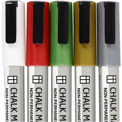 Watergedragen, niet-permanente, afwasbare markeerstift met een krijtachtig oppervlak. Krijtstiften kunnen worden gebruikt op alle gladde en niet-absorberende oppervlakken, zoals ramen, glas, porselein, kunststof en spiegels. Eenvoudig te verwijderen met een vochtige doek. . Schud de krijtstift ongeveer 20 seconden goed heen en weer en pomp de punt op en neer op een stuk papier tot de punt met verf is gevuld. Je kunt de krijtstift ook tijdens gebruik af en toe schudden en pompen om meer verf naar de punt te brengen. De krijfstift is vloeibaar en semi-dekkend en kan op verschillende oppervlakken worden gebruikt, zolang ze glad en niet-absorberend zijn. De krijftstift is niet waterproof en hij kan gemakkelijk worden afgewassen. Houd er rekening mee dat de kleuren na verloop van tijd kunnen vervagen. Houd er ook rekening mee dat de stiften permanent zijn op poreuze en absorberende oppervlakken zoals krijtborden, schrijfborden, papier, hout en textiel.