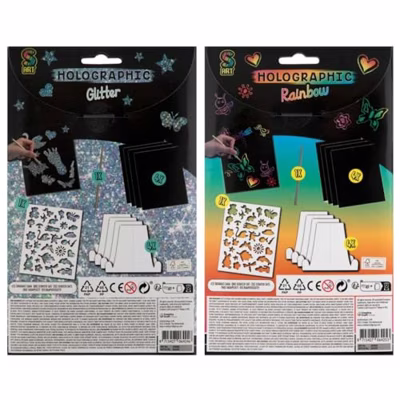 Scratch Art A4. Verkrijgbaar in verschillende uitvoeringen. U kunt niet kiezen, maar ontvangt een willekeurige uitvoering. Leg het stencil over één van de zwarte kaarten en kras met de kraspen het figuur naar keuze uit. Je ziet de glitters tevoorschijn komen van onder het zwart! Maak de mooiste glittercreaties met deze knutselset! Inhoud van de set: vier kaarten om te krassen, vier steuntjes van karton, één houten kraspen en één stencil met vele verschillende figuren om te krassen.