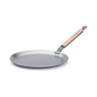 De Mineral B Crêpepan met houten handgreep is speciaal ontworpen voor het bakken van flinterdunne pannenkoeken, crêpes of blini's. De lage, schuine rand maakt het eenvoudig om crêpes om te draaien of uit de pan te schuiven. Gemaakt van natuurlijk koolstofstaal - zonder kunstmatige coating.