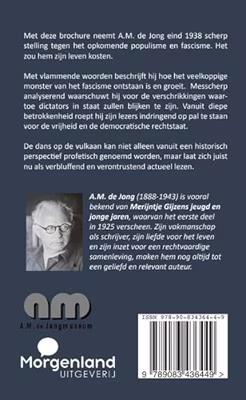 Met deze brochure neemt A.M. de Jong eind 1938 scherp stelling tegen het opkomende populisme en fascisme. Het zou hem zijn leven kosten.Met vlammende woorden beschrijft hij hoe het veelkoppige monster van het fascisme ontstaan is en groeit. Messcherp analyserend waarschuwt hij voor de verschrikkingen waartoe dictators in staat zullen blijken te zijn. Vanuit diepe betrokkenheid roept hij zijn lezers indringend op pal te staan voor de vrijheid en de democratische rechtstaat. De dans op de vulkaan kan niet alleen vanuit een historisch perspectief profetisch genoemd worden, maar laat zich juist nu als verbluffend en verontrustend actueel lezen.A.M. de Jong (1888-1943) is vooral bekend van Merijntje Gijzens jeugd en jonge jaren, waarvan het eerste deel in 1925 verscheen. Zijn vakmanschap als schrijver, zijn liefde voor het leven en zijn inzet voor een rechtvaardige samenleving, maken hem nog altijd tot een geliefd en relevant auteur.