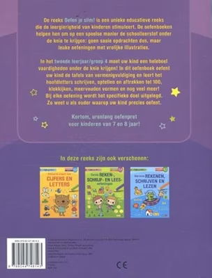 De reeks Oefen je slim is een unieke educatieve reeks die de leergierigheid van kinderen stimuleert. De oefenboeken helpen hen om op een speelse manier de schoolleerstof onder de knie te krijgen: geen saaie opdrachten dus, maar leuke oefeningen met vrolijke illustraties. In het tweede leerjaar/groep 4 moet uw kind een heleboel vaardigheden onder de knie krijgen: de tafels van vermenigvuldiging leren, rekenen tot 100, schrijven zonder fouten, enzovoort. Dit oefenboek staat boordevol speelse oefeningen die gemaakt zijn om uw kind thuis verder te laten oefenen wat het op school geleerd heeft. Want oefening baart kunst! Bij elke oefening in dit boek wordt het specifieke doel uitgelegd. Zo weet u als ouder waarop uw kind precies oefent. In dit boek oefent uw kind de tafels van vermenigvuldiging en leert het hoofdletters schrijven, optellen en aftrekken tot 100, klokkijken, meervouden vormen en nog veel meer! Kortom, urenlang oefenpret voor kinderen van 7 en 8 jaar!