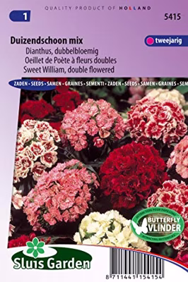 Dianthus Barbatus zaden Duizendschoon dubbelbloemig is een tweejarige snijbloem met geurige bloemen. Wordt in de zomermaanden gezaaid, vormt hetzelfde jaar een gedrongen rozet, om onder invloed van lage temperaturen in de winter tot bloemaanleg te komen. Geef ze een zonnige plek en geniet van de kleurenrijkdom. Zaaien direct in de volle grond ter plaatse, dan wel op een plantbed. Dianthus Barbatus is ook een uitstekende bijen- en vlinderplant.