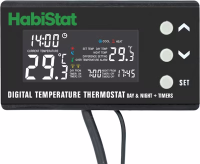 De HabiStat Digitale Temperatuur Thermostaat biedt nauwkeurige controle voor dag en nacht, ideaal voor terraria. Met instelbare timers en een helder display houdt u eenvoudig de temperatuur onder controle. Perfect voor het creëren van de ideale leefomgeving voor uw reptielen. Eenvoudig te installeren en betrouwbaar in gebruik. Optimaliseer de temperatuurbeheersing moeiteloos.Warentuin heeft alles voor huis, tuin, dier & kerst! Digitale temperatuur thermostaat dag/nacht timer Habistat - Habistat, dit komt uit het assortiment Terrariums, koop hem gemakkelijk en goedkoop online! Dit product verkopen wij per stuk tenzij anders aangegeven.
