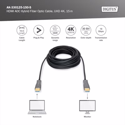 Meer over Digitus AK-330125-150-S HDMI-kabel HDMI / Glasvezel Aansluitkabel HDMI-A-stekker, HDMI-A-stekker 15.00 m Zwart 4K UHD