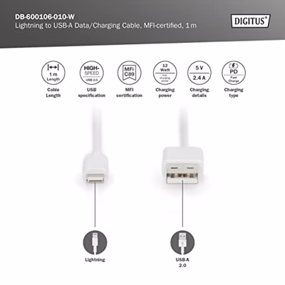 Meer over Digitus USB-kabel USB 2.0 USB-A stekker, Apple Lightning stekker 1.00 m Wit Afgeschermd, Afgeschermd (dubbel) DB-600106-010-W