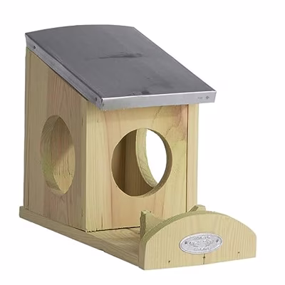 Eekhoorn Pindakaas VoederhuisEekhoorns komen in veel tuinen voor en klimmen graag in bomen en struiken. Deze knaagdieren eten bij voorkeur pinda’s, walnoten, hazelnoten en zonnebloempitten. Dit speciaal voor de eekhoorns ontworpen pindakaasvoederhuis heeft twee ingangen zodat de eekhoorn van beide kanten vanaf de boom of schutting erbij kan. Gebruik de speciale “Wild on Wildlife” eekhoorn pindakaas voor in dit voederhuis. Plaats het voederhuis niet in volle zon. De afmetingen van dit voederhuis zijn 12x24x19cm. Het huisje is gemaakt van vurenhout en zink en heeft een sleutelgat ophanghaak aan de achterkant. Exclusief pindakaas.Specificaties Hoogte: 19cm Breedte: 24cm Lengte: 12cm Kleur: Naturel Materiaal: Vurenhout en zink Geschikt voor: gewone eekhoorn, grijze eekhoorn, Amerikaanse rode eekhoorn, zwarte eekhoorn