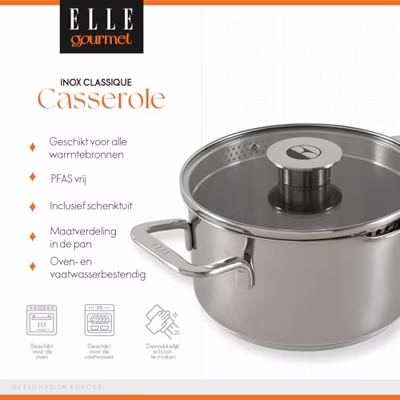 De ELLE Gourmet Inox Classique Kookpan is een prachtige toevoeging aan uw keuken, ontworpen in samenwerking met het iconische ELLE Magazine. Met een perfecte balans tussen functionaliteit en stijl weerspiegelt deze pan de tijdloze elegantie die ELLE al decennialang inspireert in de wereld van mode, lifestyle en design.