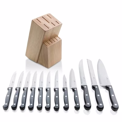Met deze 13-delige messenset van BK heb je voor elke snijklus het juiste mes bij de hand. Een klassieker in de keuken. De geklonken kunststof handgrepen hebben een speciaal ontwikkelde vorm, waardoor het mes niet uit je hand glijdt. De overgang naar het lemmet zorgt voor extra bescherming van je handen. Het messenstaal is extra gehard en roestvast. De messen zijn lekker licht en liggen vast in de hand, waardoor je er makkelijk en lang mee kunt snijden. Na gebruik kun je de messen eenvoudig reinigen in lauwwarm water met een mild afwasmiddel. Je bergt ze veilig op in het bijgeleverde messenblok.