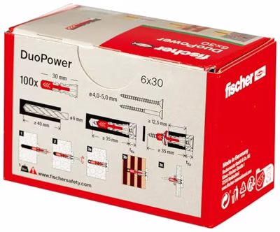Fischer DuoPower Nylonplug 6x30mm De Fischer DuoPower Nylonplug is een veelzijdige universele plug die ontworpen is voor stevige bevestiging in diverse bouwmaterialen. Met zijn unieke combinatie van twee materiaalcomponenten biedt deze plug verbeterde prestaties door middel van meerdere werkingsprincipes zoals spreiden, vouwen en knopen. Deze plug is ideaal voor zowel massieve als holle materialen, waardoor hij geschikt is voor een breed scala aan toepassingen. Belangrijkste kenmerken van de Fischer DuoPower Nylonplug * Veelzijdige toepassing: Geschikt voor gebruik in beton, volle en geperforeerde bakstenen, natuursteen, gipsplaten en spaanplaat. * Drie werkingsprincipes: Spreiden, vouwen en knopen voor optimale bevestiging in verschillende ondergronden. * Anti-rotatievleugels: Voorkomt meedraaien van de plug tijdens montage.