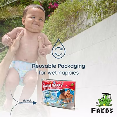 DeFreds Swim Academy wasbare zwemluier is zeer geschikt om mee te gaan babyzwemmen of wanneer je op vakantie gaat. In blauwe uitvoering met leuke zeedieren print. Maat 1: geschikt voor kinderen van 4 tot 9 kg. Deze zwemluier wordt kant en klaar geleverd: er hoeft geen booster of inlegger in. Omdat de wasbare zwemluiers er ontzettend leuk uitzien is een zwembroekje of zwempakje eigenlijk overbodig. Wasbaar en dus herbruikbaar. Met zacht microvezel binnenmateriaal voor een comfortabele pasvorm en voorzien van elastische en nauwsluitende klittenbandsluitingen voor een optimale afstelling en lekvrije pasvorm. Verkrijgbaar in blauw en roze in twee verschillende maten. Ga je veel zwemmen? Dan is het handig om twee herbruikbare zwemluiers in de zwemtas te hebben. Mocht er dan een ongelukje gebeuren tijdens het zwemmen, heb je nog een schone zwemluier om mee verder te zwemmen.