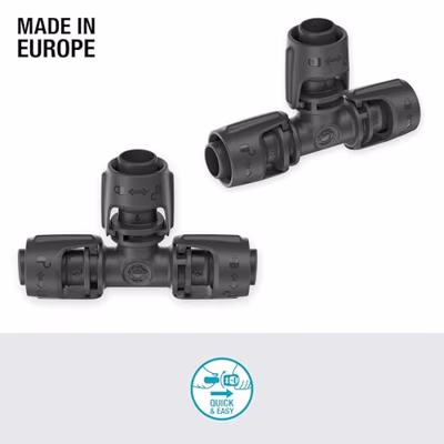 Het T-stuk 13 mm (1/2") van GARDENA biedt je een gemakkelijke vertakking van de GARDENA Micro-Drip Koppelingsbuis en Druppelbuis. De twee inbegrepen T-stukken zijn ideaal voor het vertakken en koppelen van 13 mm (1/2") buizen. De installatie is intuïtief en vanzelfsprekend, dankzij de slimme pictogrammen. Daarnaast hoor je een duidelijke klik als je hem in de gesloten positie zet, wat je een vertrouwd gevoel geeft tijdens het aansluiten. De unieke gepatenteerde koppelingstechnologie laat je je Micro-Drip-System in de tuin snel, makkelijk en flexibel uitbreiden. In combinatie met het apart verkrijgbaar Hoofdapparaat 1000 (art. nr. 13333-20) of Hoofdapparaat 2000 (art. nr. 13310-20), is het Micro-Drip-System betrouwbaar waterdicht, met een gelijkmatige waterdruk. Dankzij de gepatenteerde Quick & Easy-koppelingstechnologie kan je makkelijk alle onderdelen aansluiten, flexibel verlengen en ontkoppelen. De herbruikbaarheid van de onderdelen maakt het T-stuk duurzaam. Het T-stuk is een GARDENA-kwaliteitsproduct, gemaakt in Europa. Micro-Drip-System. Zo zorg je goed voor je planten maar bespaar je toch water. Makkelijk en nauwkeurig bewateren, om water en tijd te besparen.