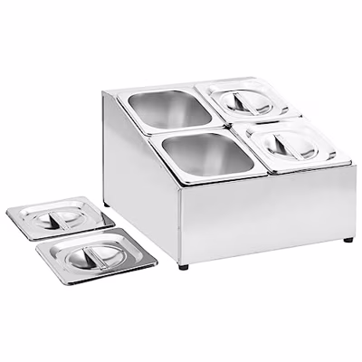 Deze bakkenhouder is een verfijnde oplossing voor het bewaren en serveren van ingrediënten, gerechten, fruit, sauzen, enz. Hij is perfect voor gebruik in restaurants, in hotels, op feesten, thuis, enz. Deze saladebar van roestvrij staal is vaatwasmachinebestendig en makkelijk schoon te maken. De anti-slip rubberen pootjes garanderen dat hij stevig staat en beschermen het werkblad tegen krassen. Deze saladebar bevat vier GN 1/6 bakken die van elkaar gescheiden kunnen worden voor eenvoudig vullen en legen. Bijpassende deksels worden meegeleverd om de inhoud vers, veilig en vrij van ongedierte te houden.