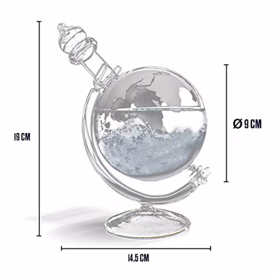 Globe stormglas van MikaMax. Chique barometer in de vorm van een wereldbol, gevuld met vloeistof en kristallen die aangeven wat voor weer het wordt. Als het gaat regenen, onweren, stormen, waaien of bewolkt is, dan veranderen de kristallen in het stormglas. Een stormglas werkt het best als het dichtbij een raam staat. Het heeft twee weken nodig om te acclimatiseren. Afmeting: 14,5 x 10 x 19 centimeter.