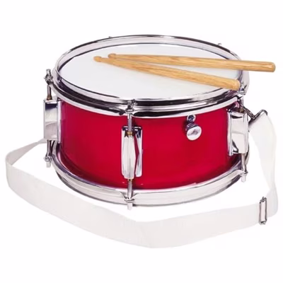 Mooie metalen trommel met twee houten stokjes en een draagkoord. Voorzien van diverse stelmogelijkheden om het vel strak te spannen.