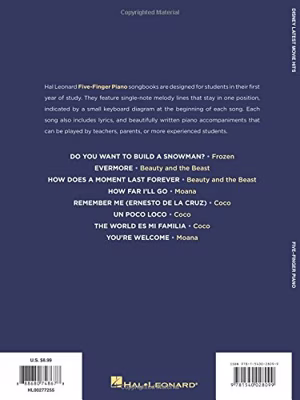 Deze acht eenvoudige bewerkingen van songs uit Disney-films zijn speciaal voor leerlingen in het eerste jaar. De arrangementen zijn geschreven voor slechts vijf vingers met telkens een klein klavierdiagram bij elke song. Tevens krijg je uiteraard bij elk nummer de songtekst maar bovendien zijn er bijbehorende begeleidingsstukken voor bijvoorbeeld de leerkracht, ouders of al gevorderde studenten om samen in duet te kunnen spelen. Enkele voorbeelden van songs zijn: Do You Want to Build a Snowman?, How Does A Moment Last Forever, Remember Me, en Un Poco Loco.