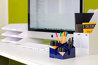 De strakke vorm zorgt voor duidelijke accenten op het bureau. Een geniale bureaukoker inclusief kaartenhouder....