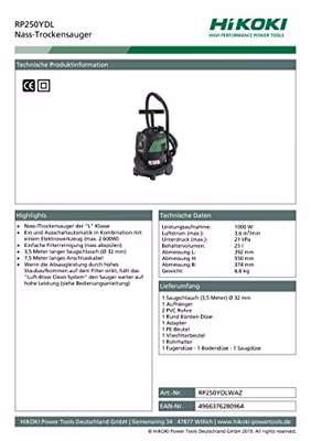 HiKOKI RP250YDL RP250YDLWAZ Nat- en droogzuiger 1000 W 20 l Stofklasse L gecertificeerd
