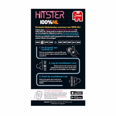 Hitster 100% NL (Pre-order)Beleef de ultieme Nederlandse muziekgame!Stap in de wereld van de Nederlandse muziekgeschiedenis met Hitster 100% NL! Deze unieke editie brengt je de grootste hits van eigen bodem, waarmee je een muzikale tijdreis maakt door verschillende decennia. Herken iconische nummers, plaats ze in de juiste volgorde en ontdek of jij de grootste kenner van Nederlandse muziek bent. Perfect voor fans van Nederlandse artiesten én voor gezellige spelavonden met vrienden en familie!Wat kun je verwachten?Hitster 100% NL is ontwikkeld in samenwerking met radiostation 100% NL en zit boordevol hits van Nederlandse artiesten. Met meer dan 300 kaarten vol legendarische tracks dompel je je onder in de rijke muziekgeschiedenis van ons land. Dit spel is een must-have voor elke muziekliefhebber!Hoe werkt het? Scan en luister: Kies een muziekkaart en scan de QR-code met de gratis Hitster-app. Het nummer speelt direct af via Spotify. Raad het jaar: Plaats de kaart in jouw muziektijdlijn op basis van het jaar waarin het nummer is uitgebracht. Check je kennis: Draai de kaart om om te zien of je het goed hebt. Juist geraden? Houd de kaart en breid je tijdlijn verder uit.Extra uitdaging? Voeg de Hitster-tokens toe voor een nóg spannender spel!Voor elke muziekliefhebberOf je nu een casual luisteraar bent of een muziekexpert, Hitster 100% NL biedt uitdagingen voor iedereen met verschillende speelniveaus: Original – Instant Party! Plaats de kaarten op de juiste plek in je tijdlijn. Pro – Jij kent je muziek! Toon je kennis van artiesten en nummers. Expert – Hardcore Hitster! Herken titels, artiesten én jaartallen als een pro. Coöperatief – Werk samen! Bouw met je vrienden een gezamenlijke muziektijdlijn.Waarom kiezen voor Hitster 100% NL?Met zijn unieke mix van muziek, spelplezier en nostalgie is Hitster 100% NL dé perfecte keuze voor fans van Nederlandse muziek en gezellige avonden. Zet je muziekkennis op de proef, ontdek nieuwe favorieten en maak herinneringen die net zo iconisch zijn als de nummers zelf.