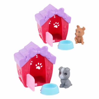 Speelsetje van een hondje in een schattig hondenhok met een voerbakje. Beide zijn uitneembaar; het hekje van het hok kan open en dicht. Gemaakt van kunststof en geschikt voor kinderen vanaf 3 jaar oud.