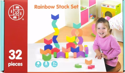 Doos met 32 houten regenboogblokken in een golfvorm. Een uitdagend bouwspel dat de creativiteit aanwakkert. Geschikt vanaf 2 jaar. Regenboog stapelblokken set 32 delig. in 8 verschillende kleuren om de mooiste bouwwerken mee te maken.