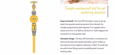 Dit apparaat werkt zoals het principe van een eierwekker. Stel een bewateringsduur tot 120 minuten in en bij het bereiken van het einde schakelt het automatisch uit. De besturing met automatische...