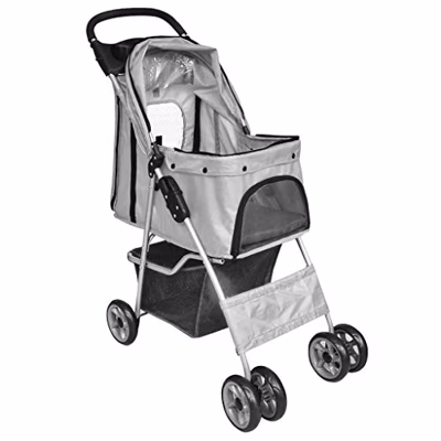 Deze wandelwagen voor huisdieren is een fantastische manier om met je huisdier een lange wandeling door het park te maken, door de buurt te lopen en zelfs om naar het winkelcentrum te gaan. Hij beschikt over een beschermend compartiment met een opening met rits voor eenvoudige toegang. De opbergmand is ontworpen om alle extra's van je huisdier in op te slaan. Hij is gemaakt van waterafstotend, scheur- en weerbestendig materiaal voor duurzaamheid. Het stalen frame is erg stevig maar toch lichtgewicht. Hij is ook binnen seconden in te klappen voor makkelijke opslag en transport. De achterwielen hebben een rem zodat de wagen niet zo maar weg kan rollen. De voorwielen zijn zwenkwielen en hebben schokdempers voor een soepele rit.