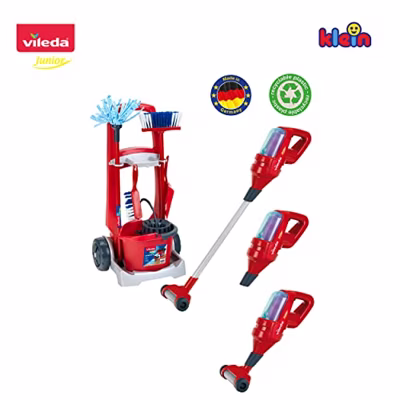 Deze prachtige schoonmaakwagen stelt kinderen in staat om schoon te maken zoals volwassenen. Tijdens het spelen stimuleren ze hun motoriek en hun verbeeldingskracht.De haren zijn gemaakt van 100% gerecycled PET-materiaal! Het ontwerp is dat van VILEDA-producten. Deze prachtige, stevige en zeer stabiele schoonmaakwagen onder VILEDA-licentie wordt geleverd met tal van essentiÃ-modus naar de Â>-modus De info in + Afmetingen van de gemonteerde wagen: 29 x 24 x 60 cm Afmetingen van de steelstofzuiger: 16 x 16 x 80 cm Geschikt voor kinderen vanaf 3 jaar. Vervaardigd in Duitsland Talrijke realistische benodigdheden. De bezem en de dweil kunnen echt worden gebruikt om schoon te maken Stimuleert de motoriek en de hand-oogcoördinatie.