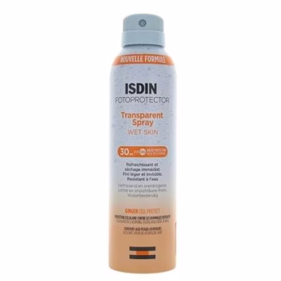 De ISDIN Fotoprotector Transparent Spray Wet Skin heeft een SPF30 en kan goed op droge of natte huid worden aangebracht. De lotionspray kan gebruikt worden voor alle huidtypes en is speciaal ontworpen voor de moeilijk bereikbare delen van het lichaam te behandelen. Door het gebruik van gember wat de natuurlijke afweer van de opperhuid activeert, zal dit beschermen tegen de schadelijke effecten van de zon. Door de samenstelling van Wetflex zal het op natte en droge huid goed beschermen tegen UVA en UVB stralen maar ook snel worden opgenomen door de huid zonder een residu achter te laten.