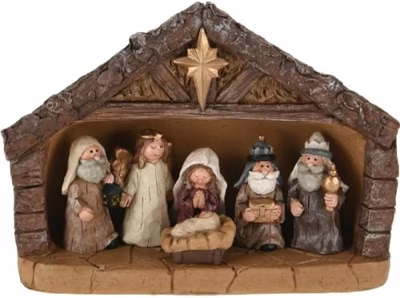 Rustiek bruin kerststalletje van 18 centimeter groot, met 6 kerstfiguren erin uitgestald: Jozef, Maria, een engel, baby Jezus en twee wijzen.