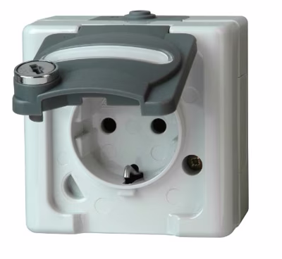 Geaard stopcontact met veiligheidsslot voor opbouw in vochtige ruimtes, 16 A, 250 V~, klapdeksel met tekstveld, afsluitbaar, met 2 sleutels, sluiting type 0, IP44, Blue Electric, grijs....
