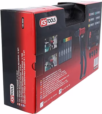 • Geschikt voor blindklinknagels, blindklinkmoeren en voor blikkrabber • met 2 plaatkrabinzetstukken • inclusief 4 verwisselbare mondstukken en 4 verwisselbare klinkmoeren trekpennen • smalle...