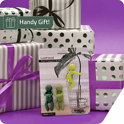 Leafriend stekjeshouder (set van 3) van Peleg Design. Set van drie poppetjes die helpen om je stekjes op hun plek te houden in een vaasje of glas. De poppetjes hebben alle drie een andere kleur groen en worden met hun billen aan het glas geklemd. Ze houden het stekje vast in hun handen. Afmeting per poppetje: 6,6 x 3,5 x 2,3 centimeter.
