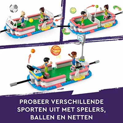Sport is goed voor je - zelfs in Heartlake City! Niko is verhuisd naar Heartlake City en ontmoet Leo tijdens het voetballen. Vandaag vergezellen de twee Ivana en Hanna om alle verschillende sporten uit te proberen die het sportcentrum te bieden heeft. Er is voetbal, basketbal, tennis en een klimmuur. Het speelveld kan voor verschillende sporten worden gebruikt door de doelen en netten te verwisselen. Er is ook een scorebord en een opslagruimte voor de ballen. Na het spel kunnen de vrienden naar de fitnessruimte of direct naar de kleedkamer. En dan trakteren ze zichzelf op een pauze - en een kleine snack. De set bevat vier Friends speelfiguren: Niko, Leo, Ivana en Hanna en veel accessoires voor verschillende sporten.